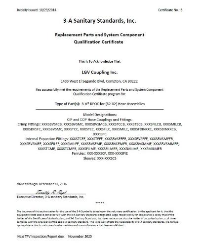 | 3-A REPLACEMENT PARTS AND SYSTEM COMPONENT QUALIFICATION CERTIFICATE |